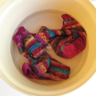Céline apporte à son cours plusieurs chaussettes différentes pour qu'on puisse apprécier les différentes laines et modèles. Elles sont complètement pressées... comme si elles arrivaient d'une boutique. Son secret : "le blocage."