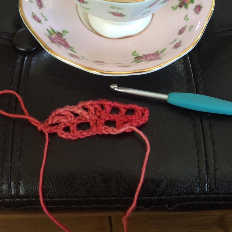 5 ml, 1 ml pour tourner, 1 ms, 1 demie bride, 1 bride, 1 double bride, (1 bride, 1 demie bride, 1 bride) dans la 5ième maille, en revenant sur votre ouvrage, 1 double bride, 1 bride, 1 demie bride, 1 ms, 1 ml.